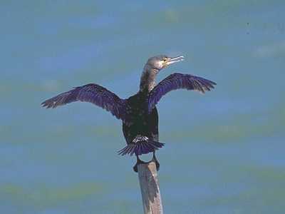長い頚をのばし、全身が水面下に沈みそうに浮いている。水中に潜って魚類などをよく捕食する。飛翔時はV字などの編隊飛行をする。樹上に営巣し、コロニーを形成することが多い。翼を拡げてかわかしている光景を見かける。 |