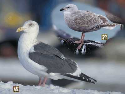 雌雄同色。セグロカモメと似ている。夏羽では背から翼が濃い灰褐色。頭から下面は白い。嘴は黄色で、脚はピンク色。冬羽では、頭部に褐色の斑がでる。幼鳥は全身淡色で、黒褐色の斑がある。 |
